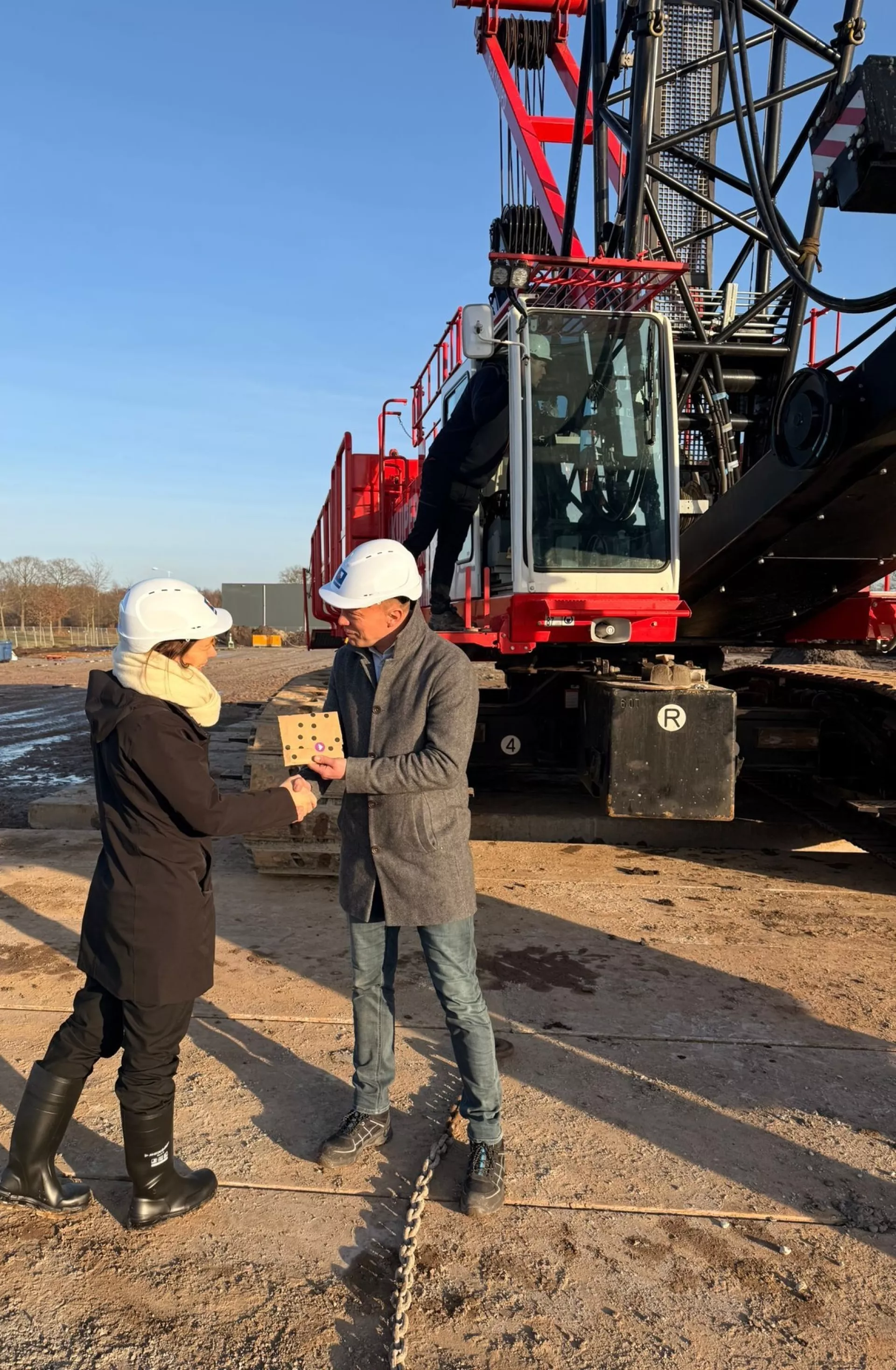Wilja Strating (bestuurder Certe) en Sjouke Sijtsma van Bouwgroep Dijkstra Draisma waren afgelopen dinsdag aanwezig op de bouwkavel om stil te staan bij de start van het heiwerk. Met zon, een strakblauwe lucht en de bouwhelm op schudden zij elkaar de hand op deze mijlpaal.